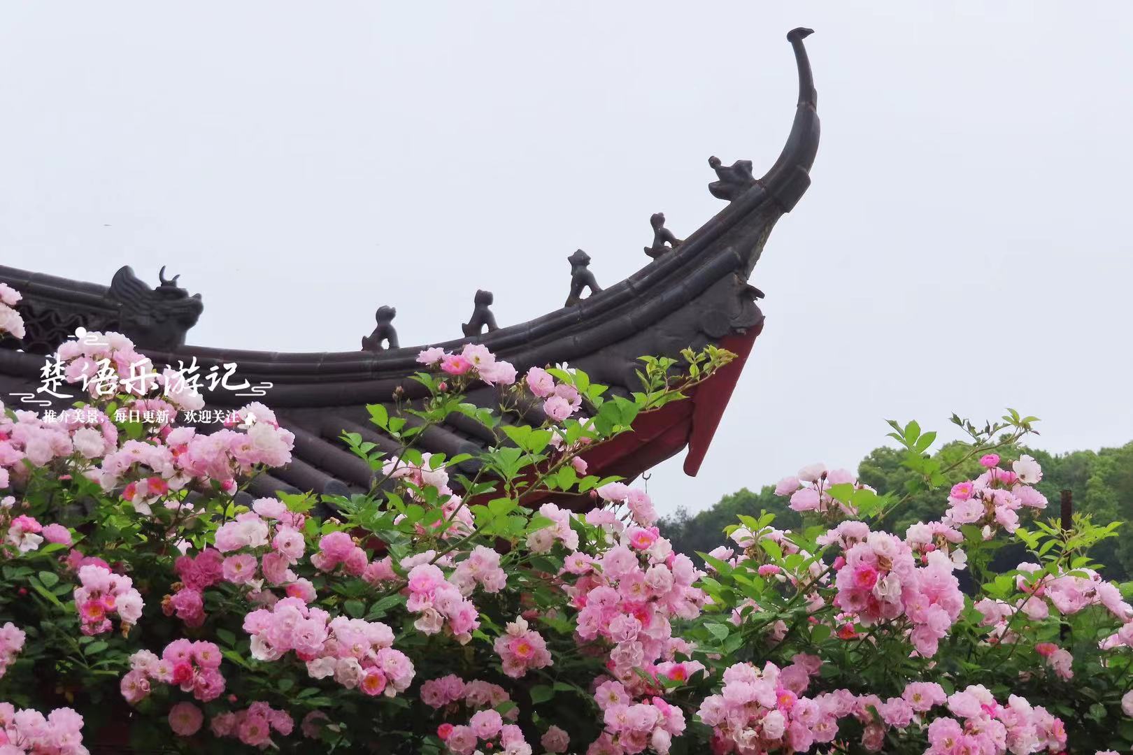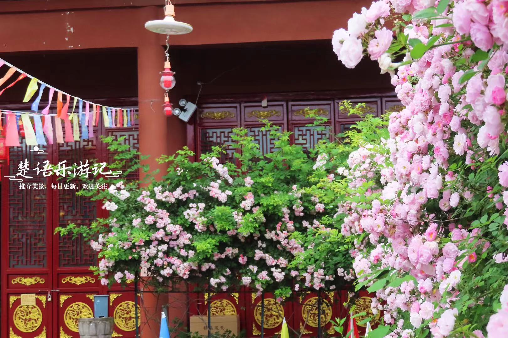 粉白相间的花朵和藤蔓绿叶、粉墙黛瓦、朱柱红窗、红色古灯、多彩旗帜一起,构成了色彩缤纷的画面,尤其是庙宇的翘角飞檐被花朵为簇拥,于春色之中透露着禅意,于微风之中散发着香气,分外美丽。