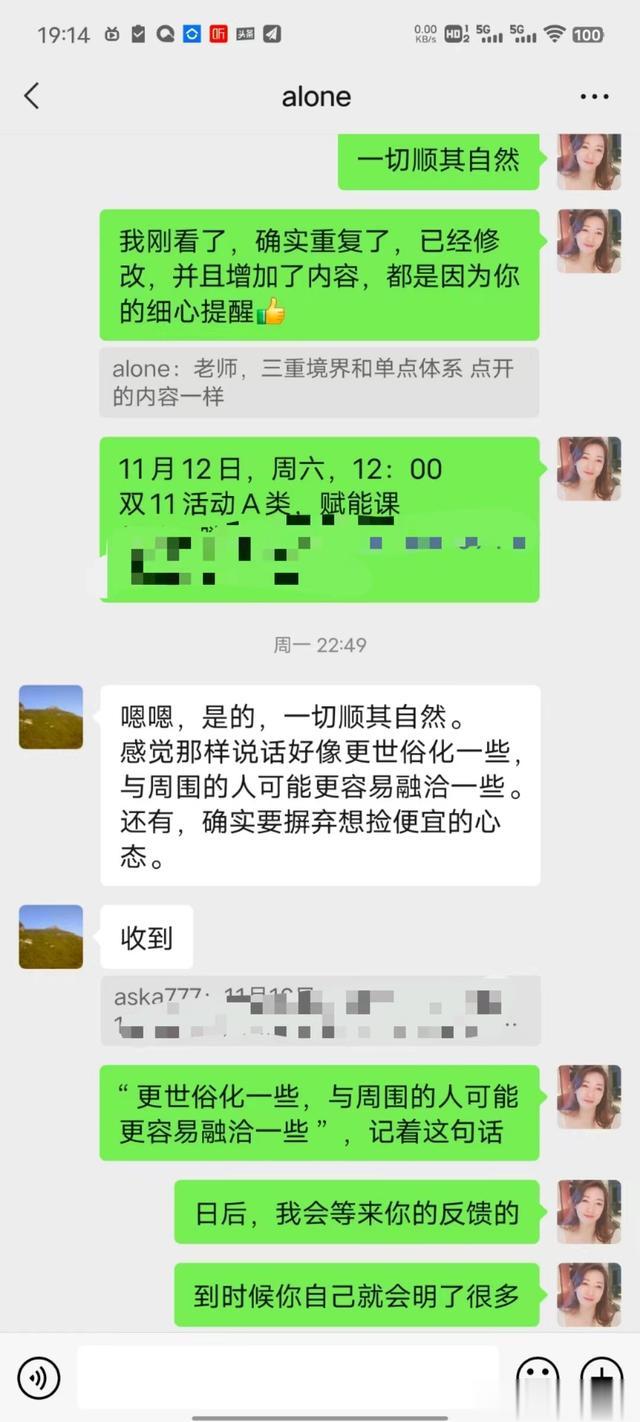 起初是alone一人,我讲了顺遂之法,因其与我有缘,这种形式恰是他应时应刻的所需,因他自身本有想要提升成长在前,而遇我及课程都是相应之法,这才最佳安排