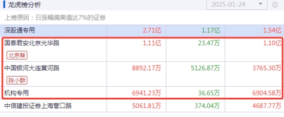 4)1月24日知名游资北京帮和陈小群疯狂抢筹,分别净买入1.1亿元和3765万元,导致股价直接封板。