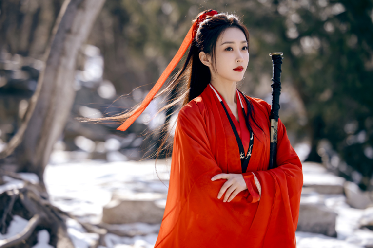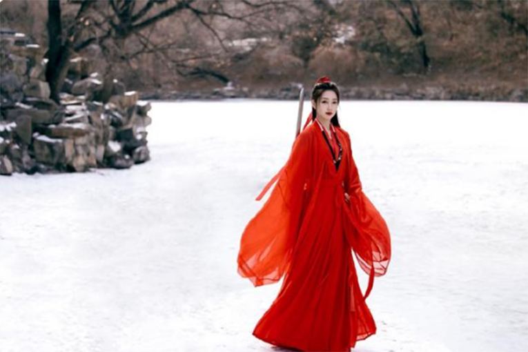 一袭红衣在雪地中更显美艳无双,将剑背于身后,披发仗剑,飒也,身姿挺拔,更显故事感,心动的感觉,魔教圣女既视感,好飒的侠女!一席红衣入人心,一棵梧桐伴冷月,期待宣璐的凤栖梧。最后,祝福她!