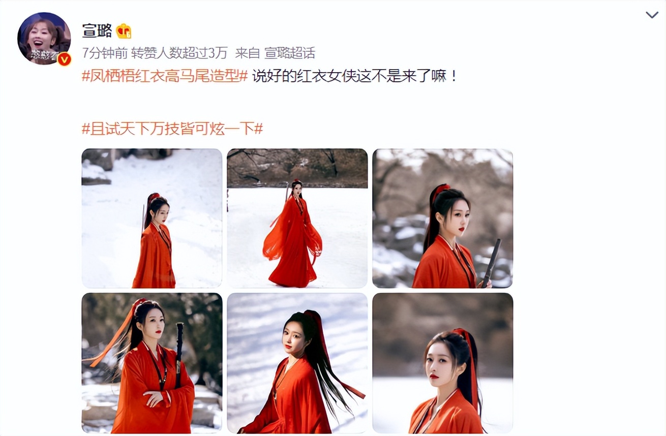 宣璐工作室更新动态,发文:宣璐&凤栖梧红衣高马尾造型,一袭红衣尽显风华,休言女子非英物!双手挥剑发丝飘扬,英气逼人,红衣高马尾造型明艳大方,一看武力值就很高,妥妥的女侠,太惊艳,非常有气质。