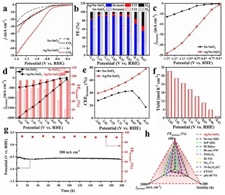 值得注意的是,为了解决下游分离成本问题,研究人员将多孔固体电解质(PSE)层引入到以Ag/Sn-SnO2 NSs作为阴极催化剂的膜电极组件反应器(MEA)中,该组件能够连续工作200小时,并将CO2还原为约0.12 M的纯HCOOH溶液。总的来说,该项工作对进一步开发先进的电催化剂和创新的装置系统,促进CO2还原制取液体燃料的实际应用具有重要的指导意义。