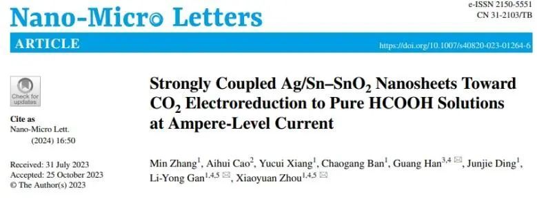 Strongly coupled Ag/Sn–SnO2 nanosheets toward CO2 electroreduction to pure HCOOH solutions at ampere-level current. Nano-Micro Letters, 2023. DOI: 10.1007/s40820-023-01264-6