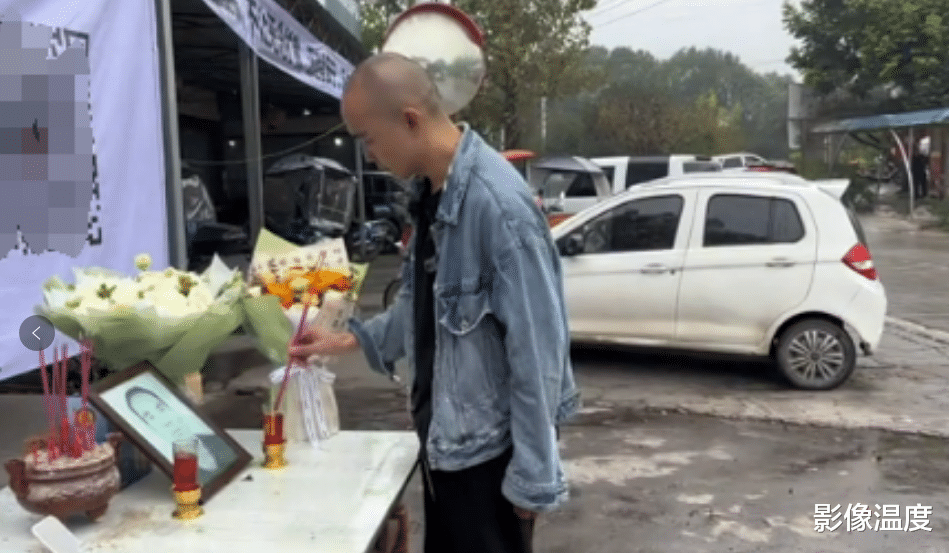 凶手的家和受害人家距离大概有100多米远,杀人犯把酒席摆到了受害者家门口,受害者也把父亲的遗像拿出来摆放在门口,开始祭拜,大家看现场图,受害人家属光着头,给自己父亲上香:
