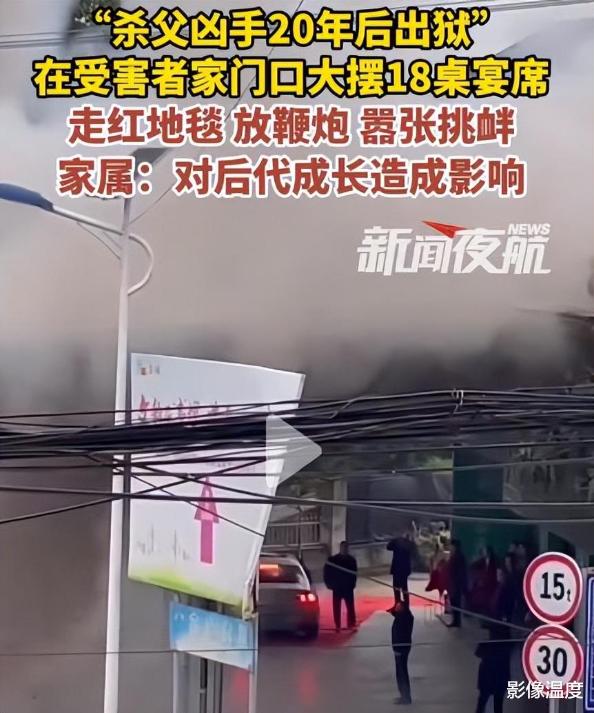 真没有想到,会发生这样让人无比愤怒的事情:一个杀人犯坐监狱20年,刑满释放后,不反思自己存在问题,竟然在受害人的家门口,嚣张地放起鞭炮、还在人家门口走起红毯、然后大摆宴席18桌,来进行挑衅!