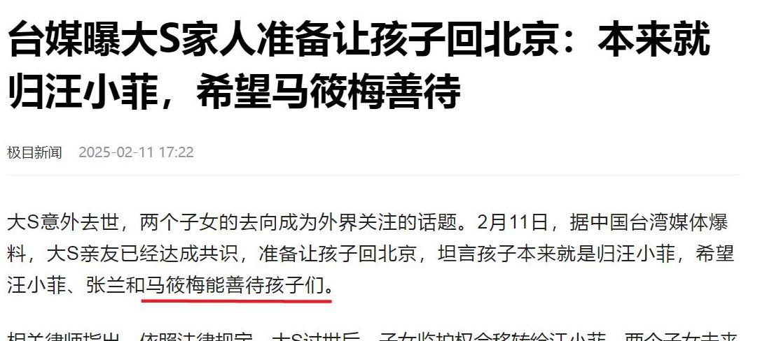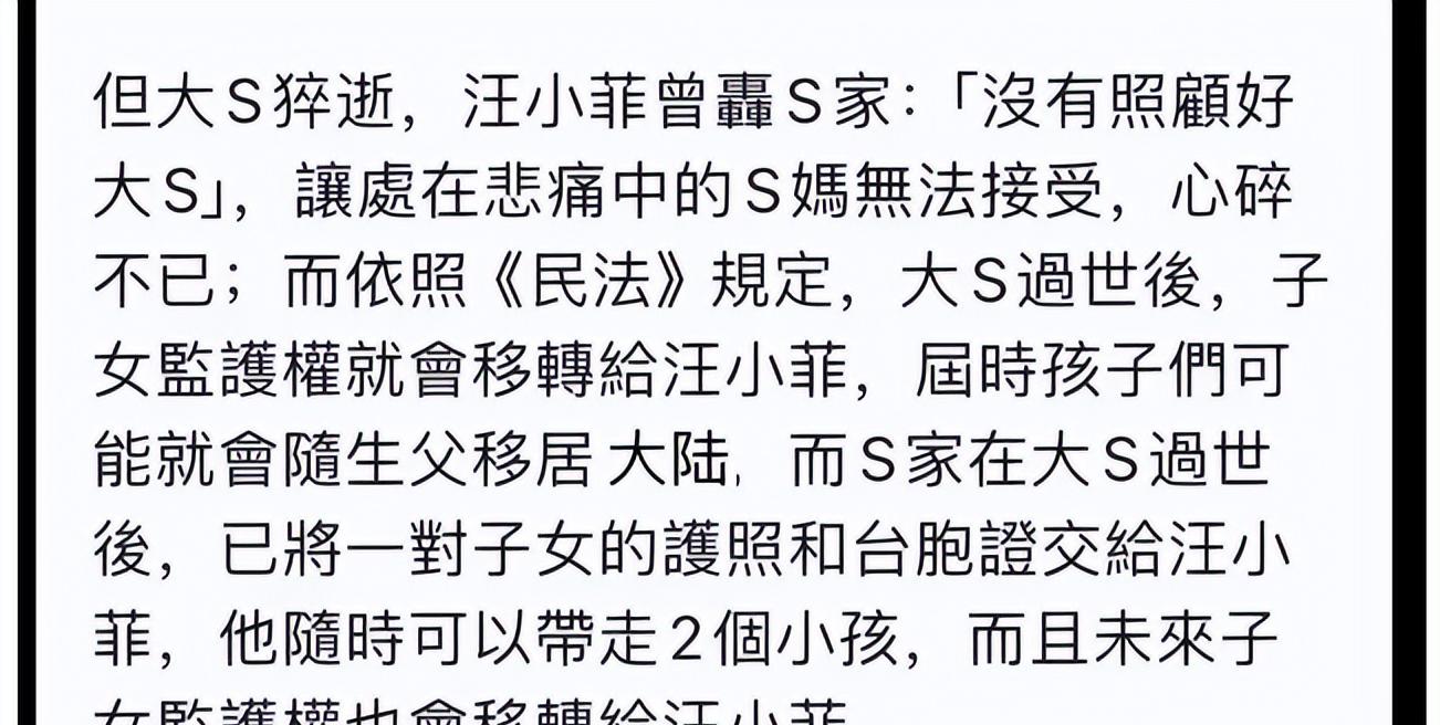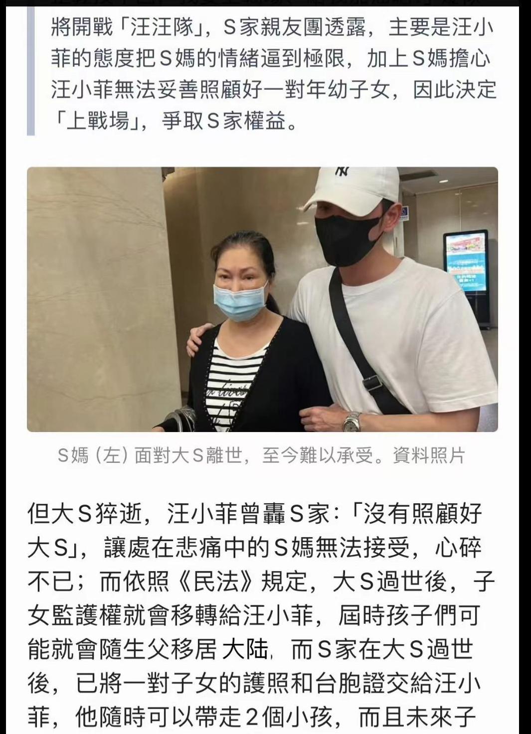 据台媒报道,S家亲友团透露,这是因为汪小菲的态度让黄女士极其愤怒,而且她担心汪小菲无法照顾好孩子。