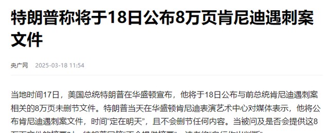 原文刊载于央广网2025-03-18关于“特朗普称将于18日公布8万页肯尼迪遇刺案文件”