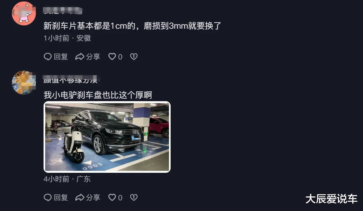 博主说车企刹车盘减配,薄得像纸?网友:为了火也是绝了,拿两轮的当四轮,不要太离谱,好吧!