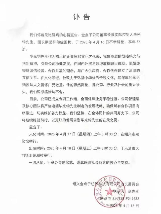 根据红星新闻的报道,这个事情刊登于2025年4月17日发布的《致哀!绍兴知名纺织企业董事长突然离世,享年56岁》