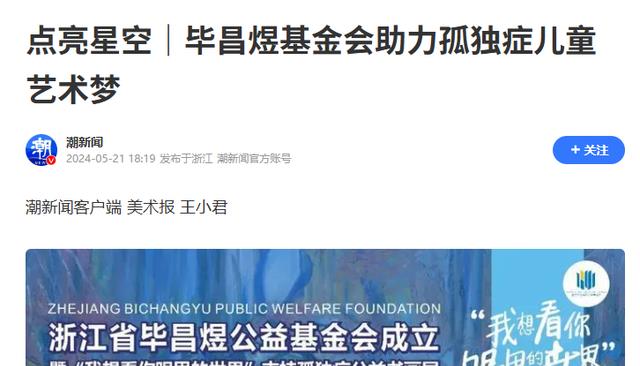 根据潮新闻的报道,这个事情刊登于2024年5月21日发布的《点亮星空|毕昌煜基金会助力孤独症儿童艺术梦》