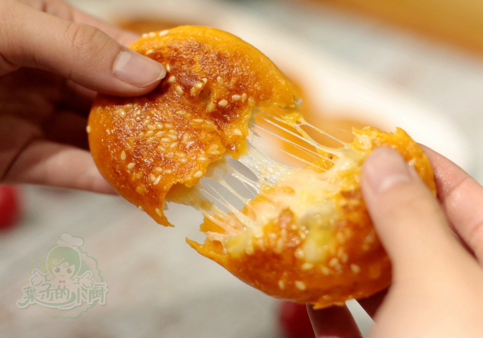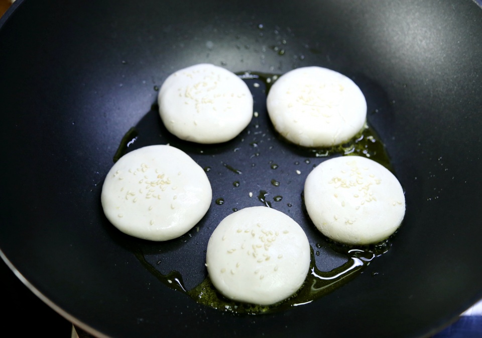 包好的饼胚轻轻压扁,然后表面稍微沾点水,再沾上点熟芝麻。