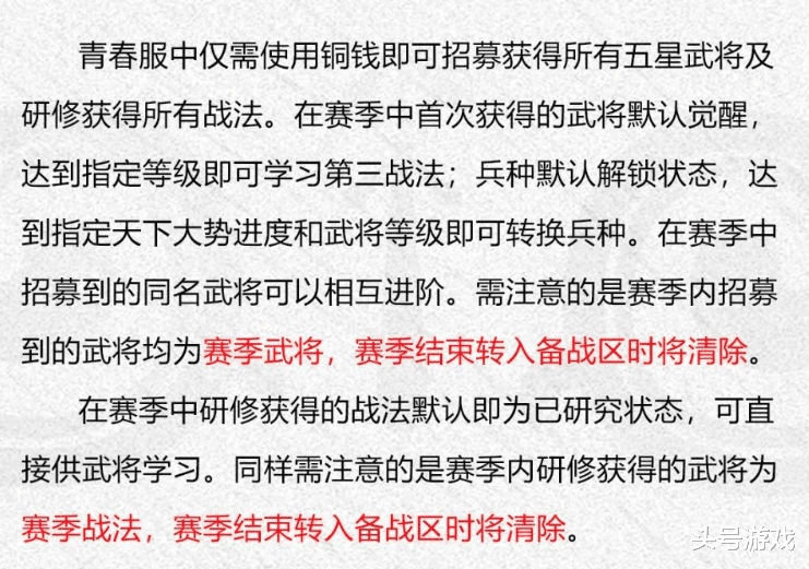 最最最关键的是,这个青春服除了抽卡不用氪金道具只需要花费铜钱之外,还删除了包括宝物、文臣在内的大量玩法,将玩家首次获得的武将默认到觉醒状态,兵种默认到解锁状态,让同名武将可以相互进阶。