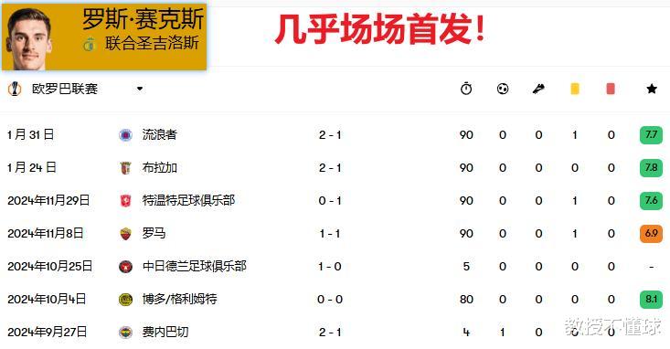 赛克斯本赛季各项赛事踢了46场,打进5球拿到1助攻,是圣吉联合不可或缺的人物。