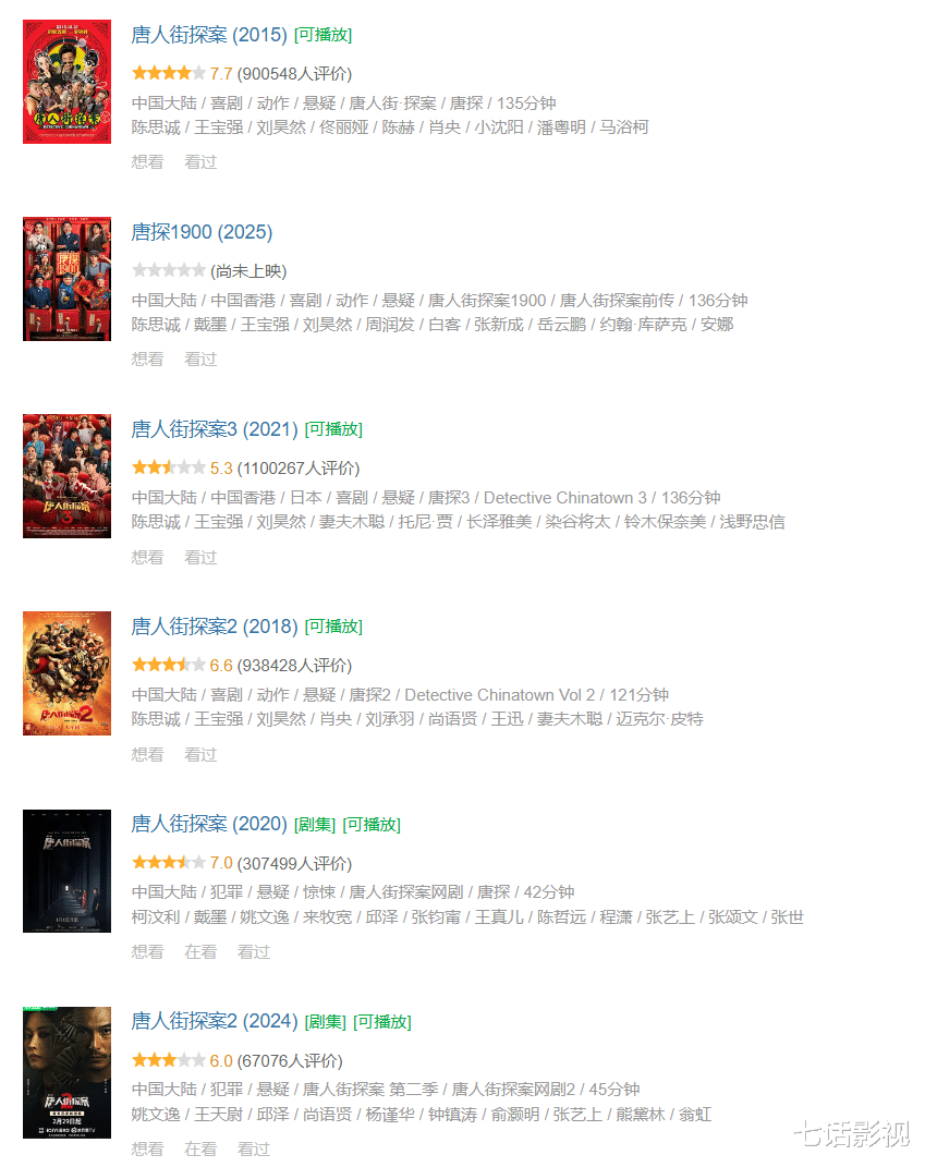 《唐探1900》,烧脑喜剧陈思诚+王宝强+刘昊然=春节档王炸,前3部票房都很惊人,虽然唐探第三部口碑滑铁卢,却没影响唐探宇宙的赚钱能力。
