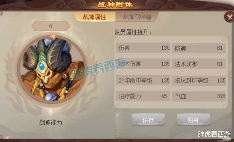 3000万战神的属性加持有多恐怖呢?用数据来说话:+135伤害/法伤,+81防御/法防,+135封印/抗封,+45治疗,+378气血,还有一些召唤兽属性加成。