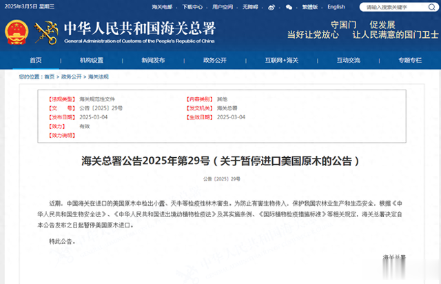 3月4日,海关总署发布公告称,近期,中国海关在进口的美国原木中检出小蠹、天牛等检疫性林木害虫。为防止有害生物传入,保护我国农林业生产和生态安全,根据《中华人民共和国生物安全法》《中华人民共和国进出境动植物检疫法》及其实施条例、国际植物检疫措施标准等相关规定,海关总署决定自本公告发布之日起暂停美国原木进口。