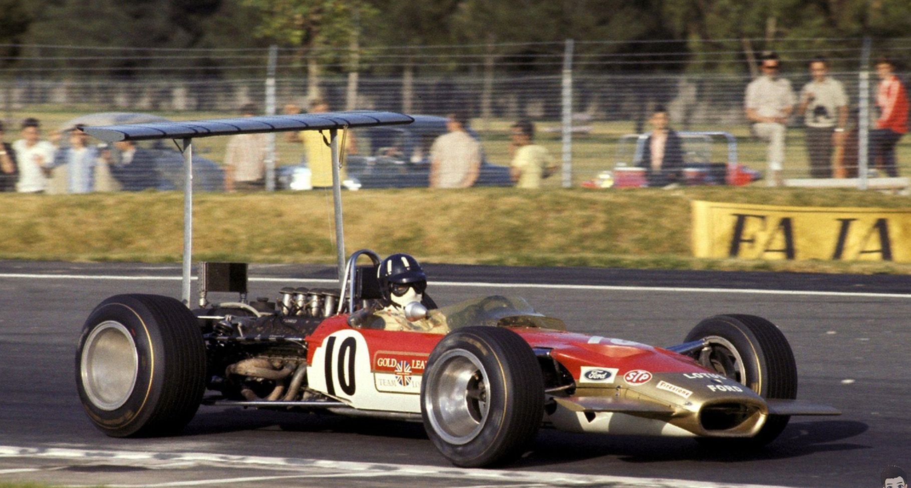 尾翼:起初的F1外观都如雪茄状,没有今天这样夸张的尾翼。最先加入尾翼设计的是在1968年的莲花49B赛车上,设计的初衷是为增加赛车的下压力以保证在弯道中的稳定性。紧接着在接下来的各站比赛中,多支F1车队纷纷给自家赛车加入了尾翼设计。