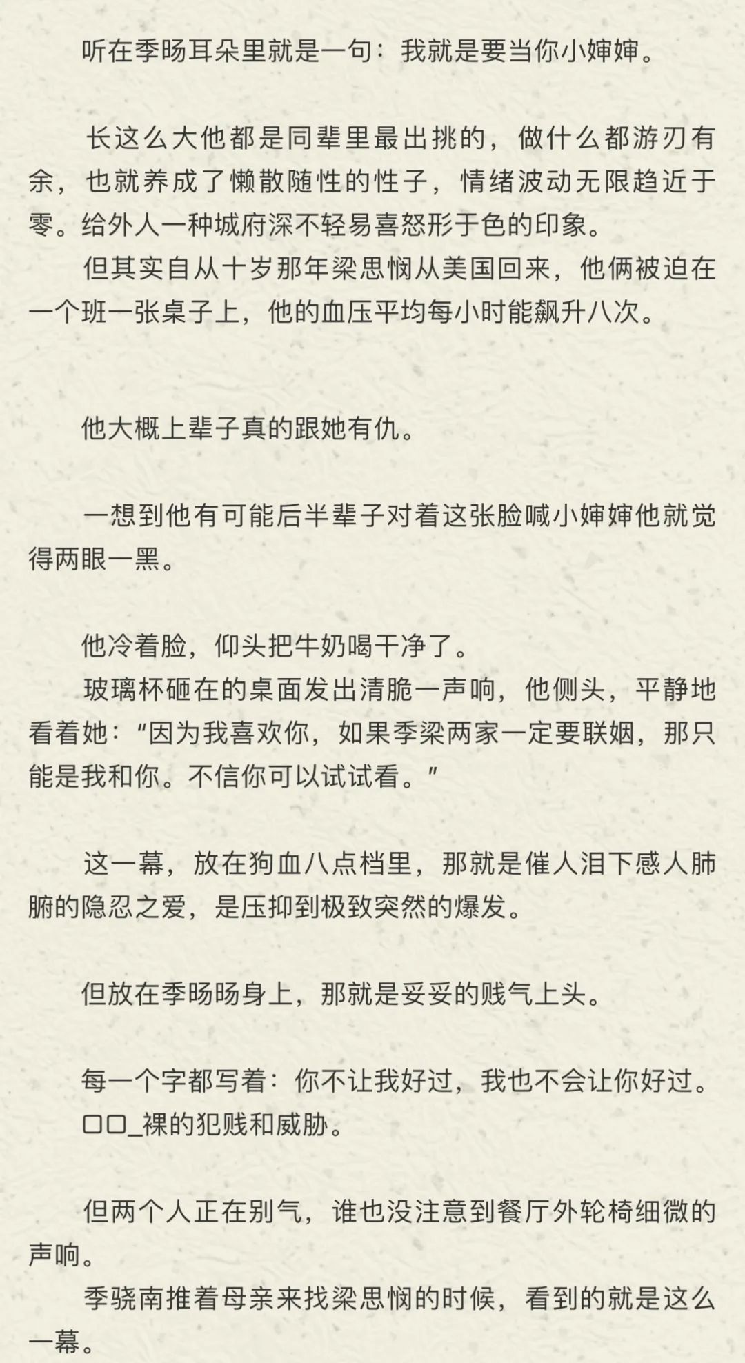 这本的梗还是我们熟悉的青梅竹马+欢喜冤家+豪门联姻的配方,因此昨天晚上看到之后我马上开冲,熬夜看到了三点啊!!