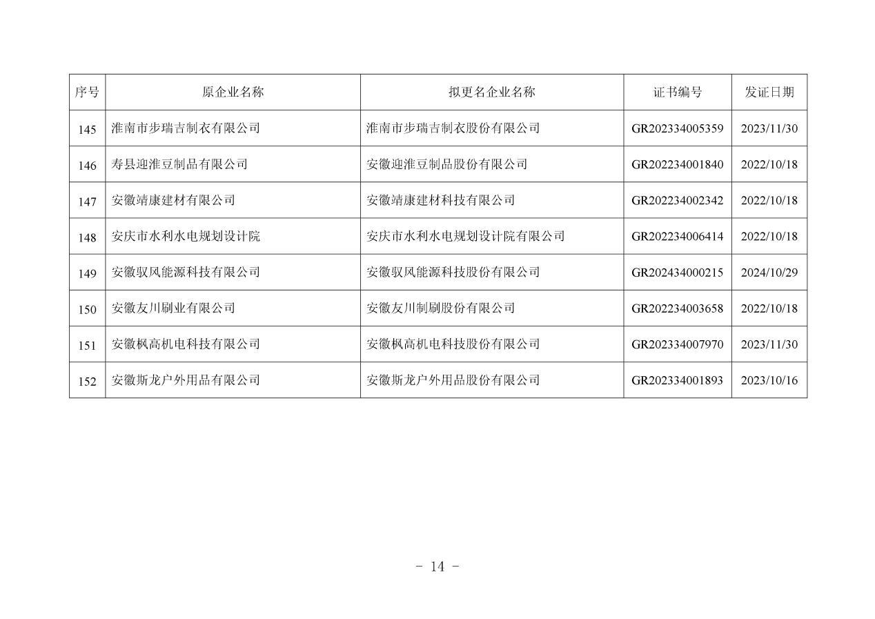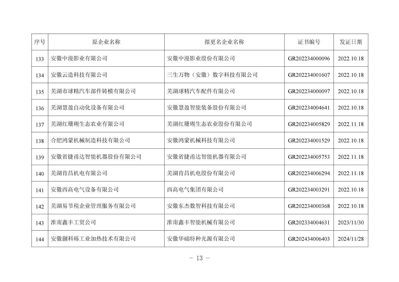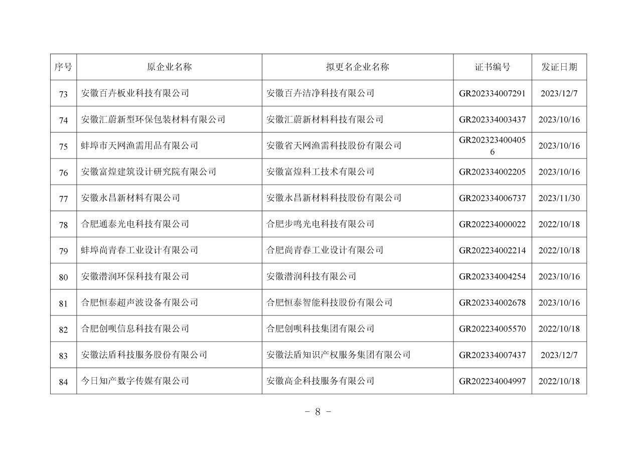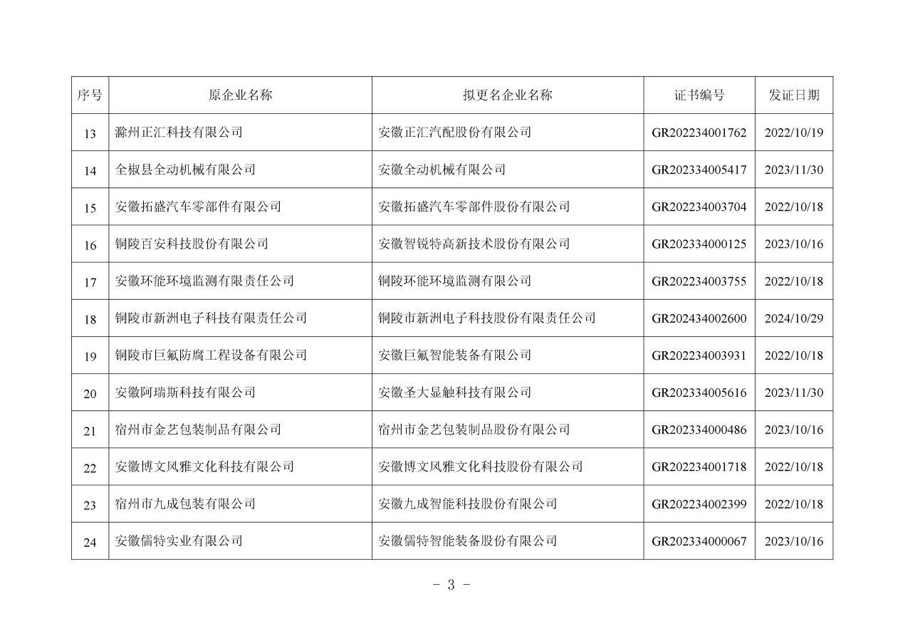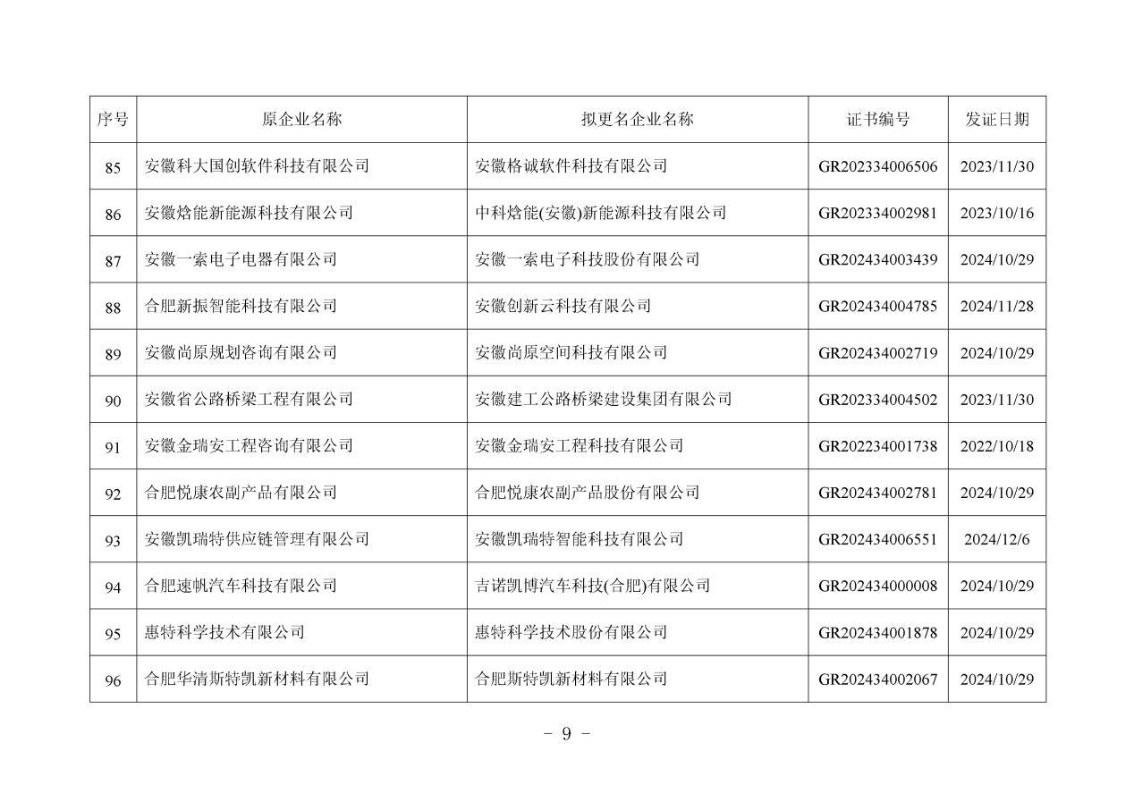 近日,安徽省工业和信息化厅发布《关于拟更名高新技术企业(2025年第一批)名单的公示》。