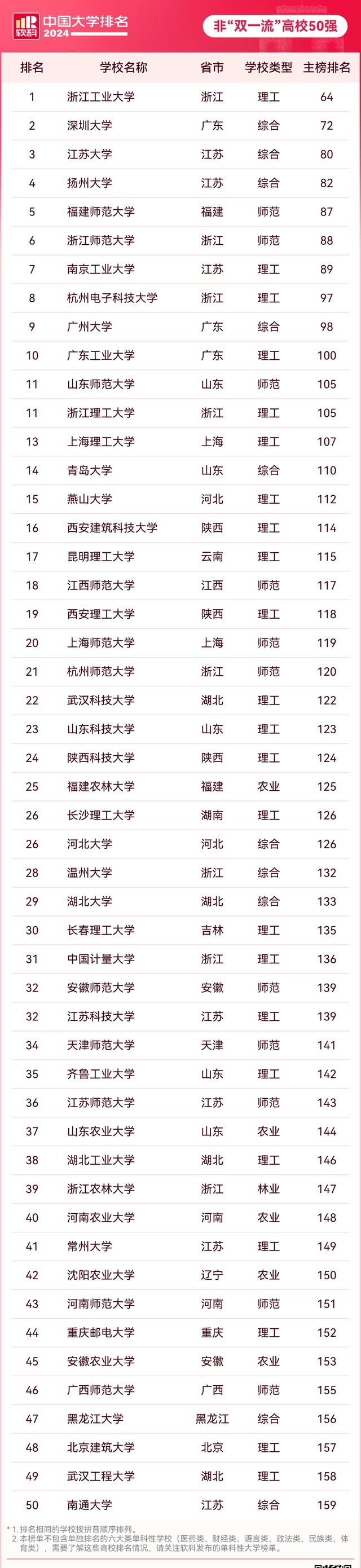 软科公布的非“双一流”高校50强,您看后认可吗?就在本月国内又有一版备受关注的大学排行榜公布了2024年最新的高校排名,这就是软科高校排行榜,而从其给出的非“双一流”高校(其实就是双非高校榜单)分榜来看,共有50所大学进榜。