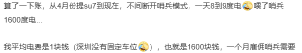 再比如我们日常体验较多的哨兵模式!你知道在陌生的繁华路段打开这个功能需要消耗多少电量吗?基本是一天10度电的水平!如果没有固定车位,电费达到了1.5元/每度电,基本每天的花费在15元人民币,甚至在很多地区比租一个固定车位还要昂贵。如果再叠加车载冰箱功能,每天15度电,你想过这是什么概念吗?即使一周没有驾驶新车,那么电费也要花费160元左右。作为对比,很多油车用户基本每个月的油费也就200元左右,所以电车并非我们想的那般省钱。