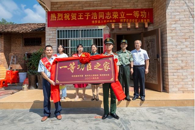 广东省惠州市政府、军分区、退役军人事务局及博罗县有关领导为罗阳这位荣获一等功的“00”后军人家庭报喜