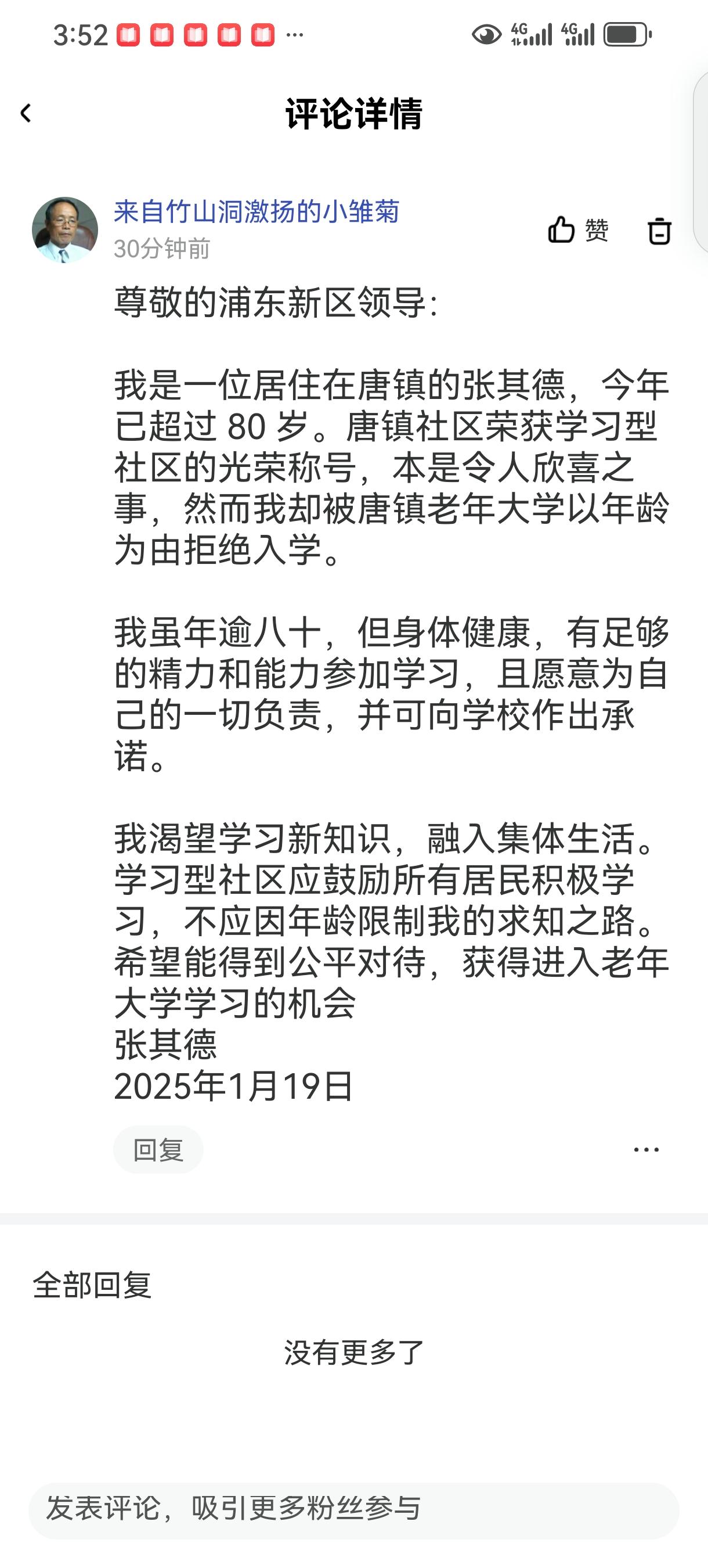 “尊敬的浦东新区领导:我是一位居住在唐镇的张某某,今年已经超过80岁。唐镇社区荣获学习型社区光荣称号,本是令人欣喜之事,然而我却被唐镇老年大学以年龄为由拒绝入学。张