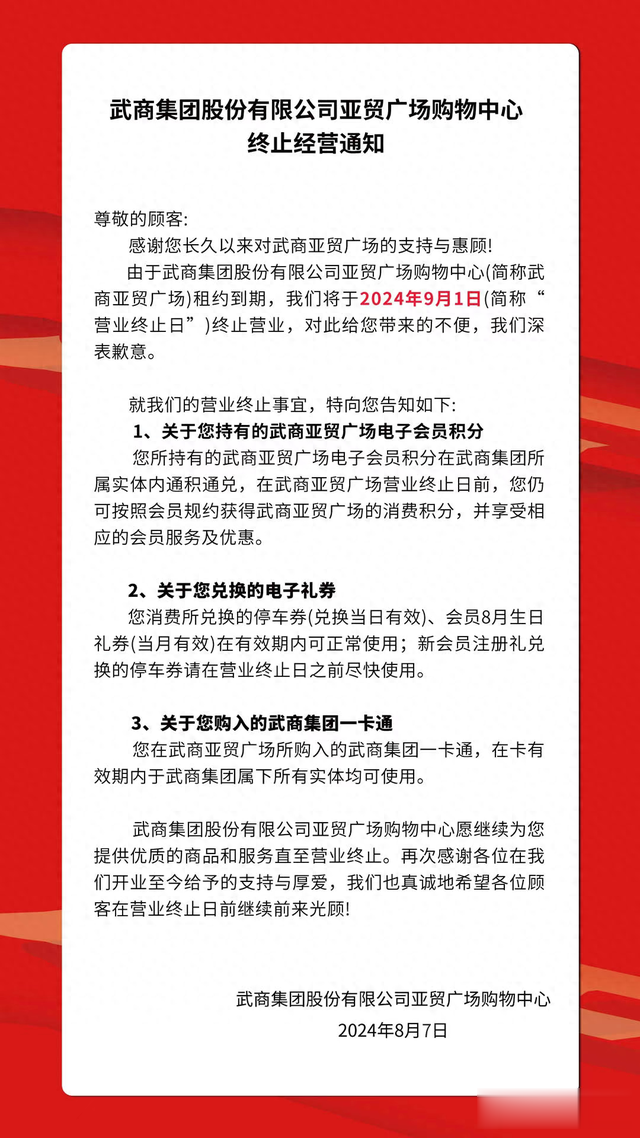 2024年8月7日7时许,武商亚贸广场在官微发布公告:宣布因“合约租期届满”,亚贸广场将于9月1日终止营业,闭店清仓!亚贸广场不再续租、将注销。该消息一出,引发市场强烈关注,作为武汉一代商业传奇,曾经武汉商业的王者,还是没有逃脱关闭的命运,令人唏嘘不已!