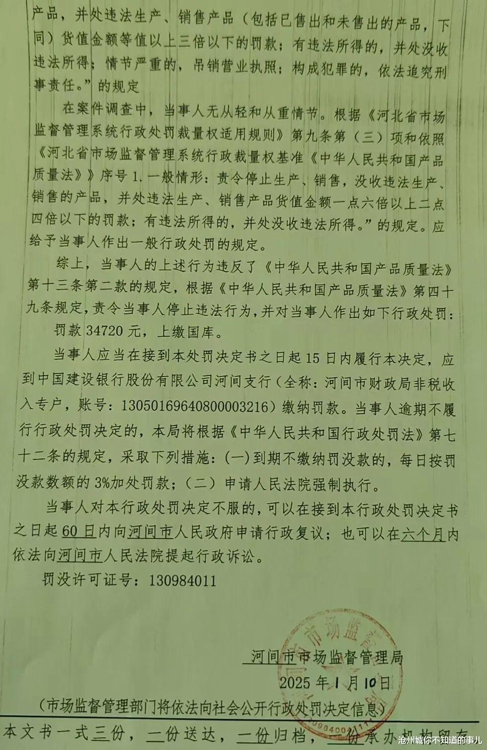 近日,河北省人民政府网站“行政执法公示平台”发布了河间市市场监督管理局于1月10日作出的“河市监处罚〔2025〕0006号”行政处罚决定书。