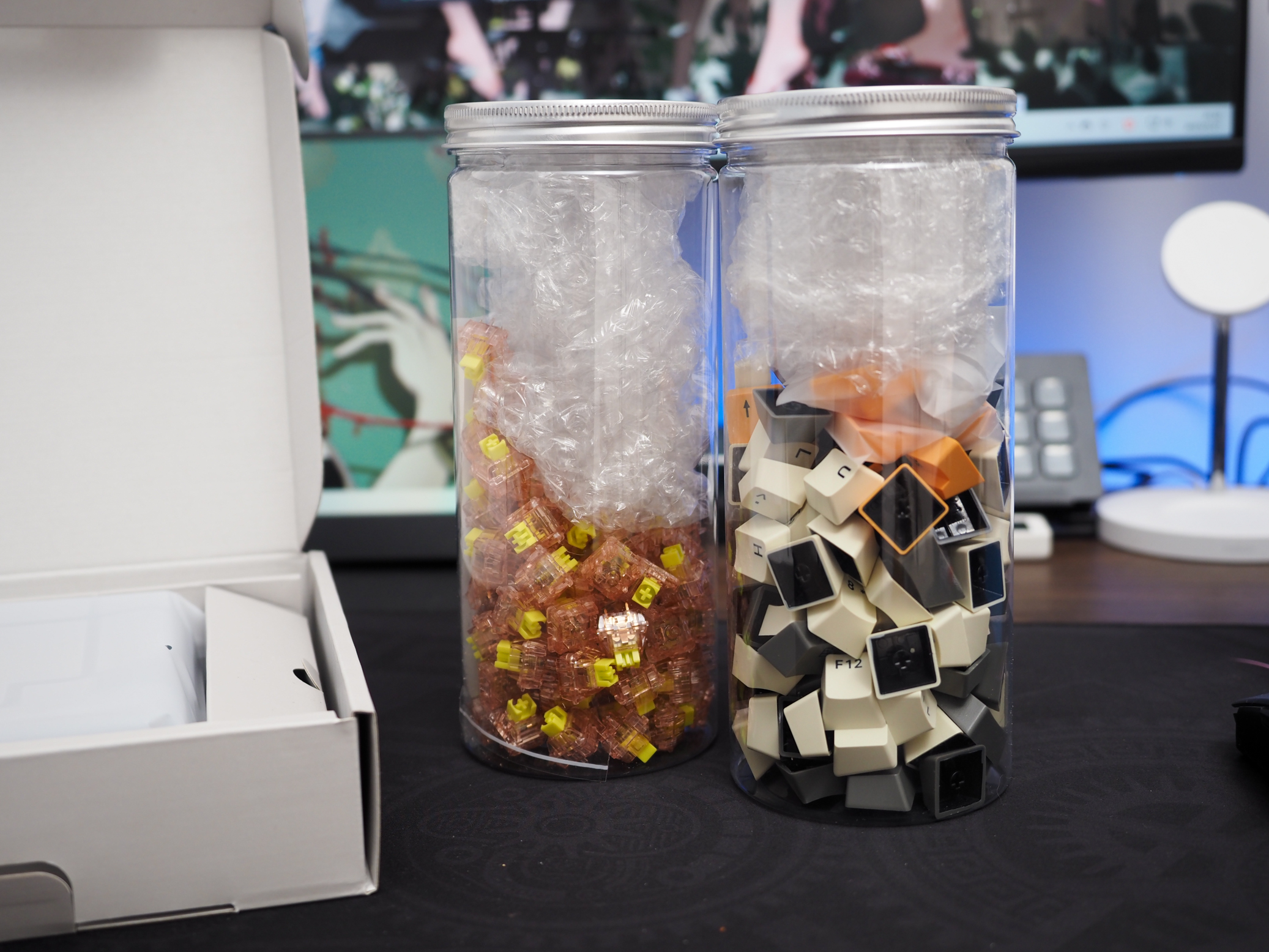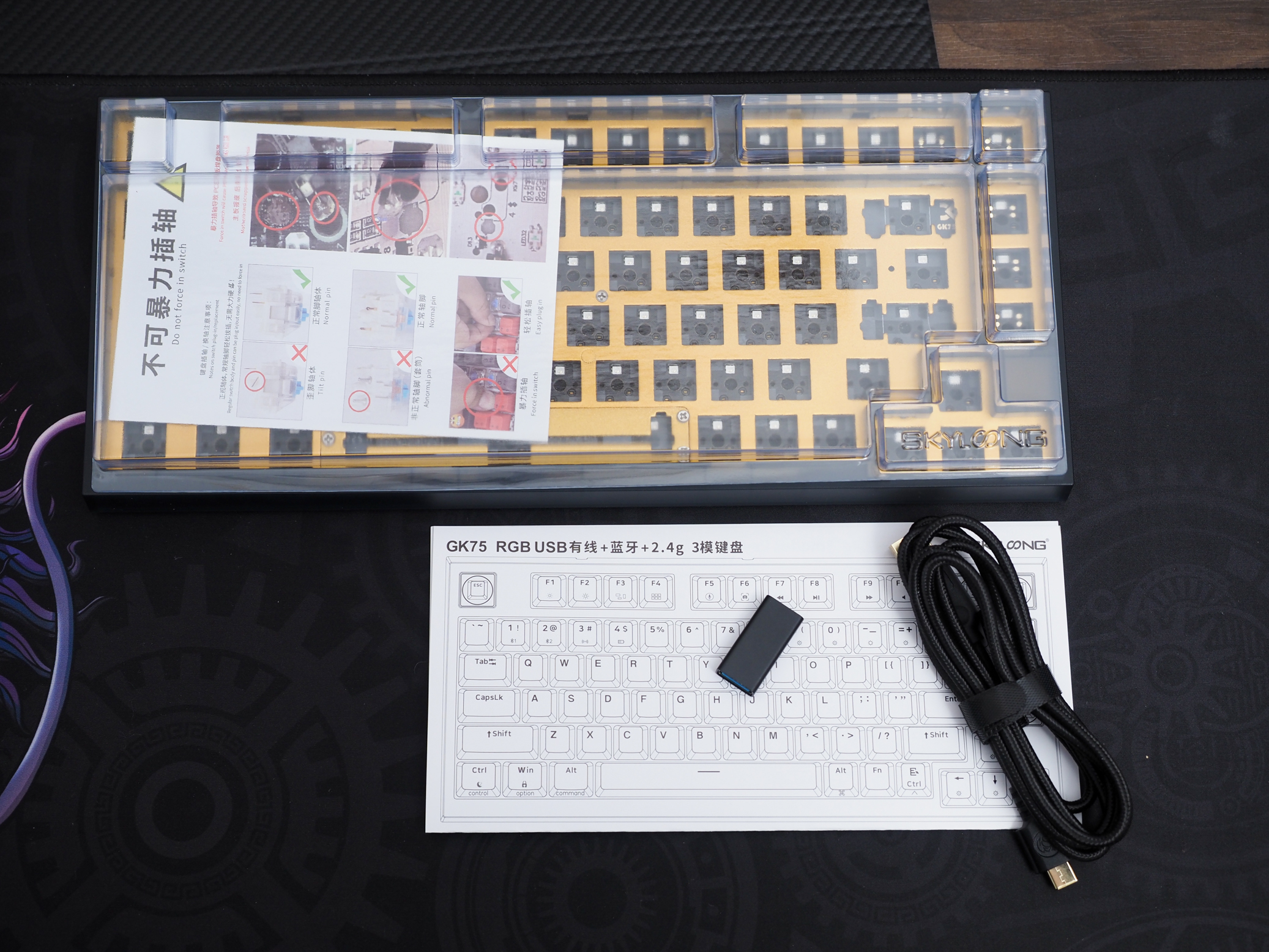套件打开,配件还是比较全的,套件、防尘罩、一张警告说明、说明书、转接器、USB Type-C连接线,轴体和键帽都有独立筒装,收纳起来非常方便,摆起来也很好看。