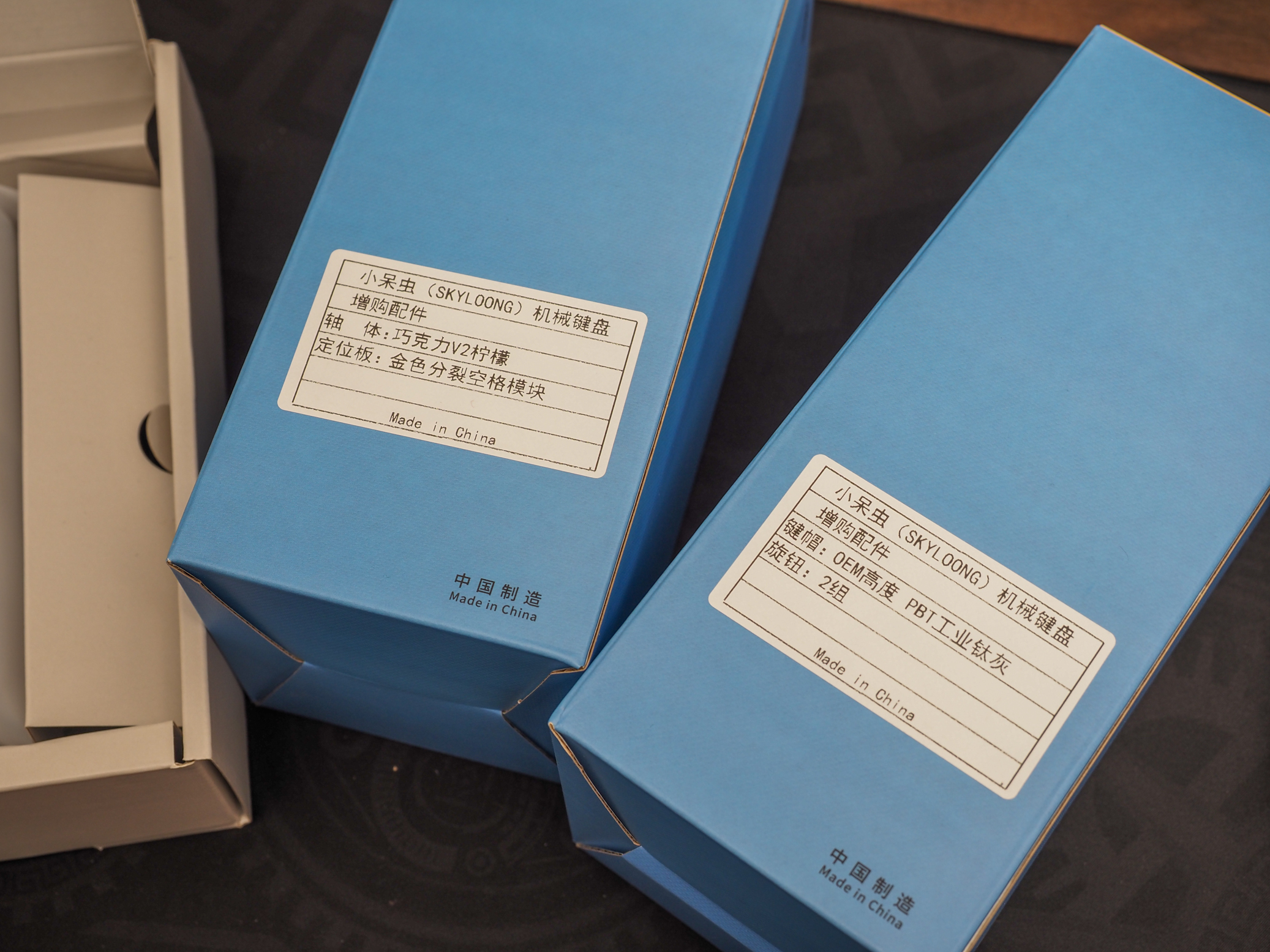轴体我选的是巧克力V2柠檬,包含一个定位板,金色分裂空格模块,键帽选的是OEM高度的PBT工业钛灰,而且有两个旋钮按键,还是挺期待的。