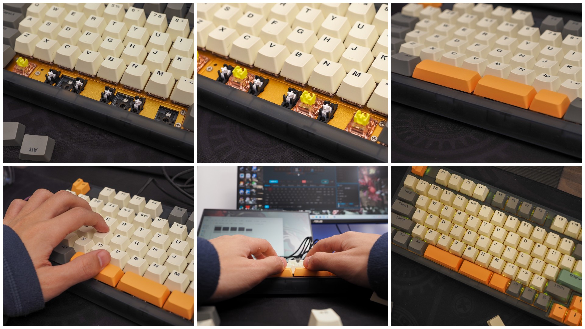 轴体安装就比较简单了,我一个没玩过套件的人也能轻松上手,先把卫星轴装上,再把柠檬轴对准针脚的位置一个一个摁进去,因为支持热拔插,安装过程其实开电也没什么问题,全部装完连接电脑把按键都试过去确保能正常触发就行。