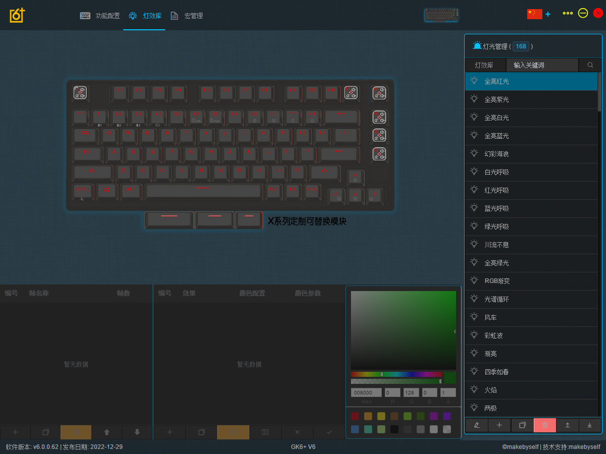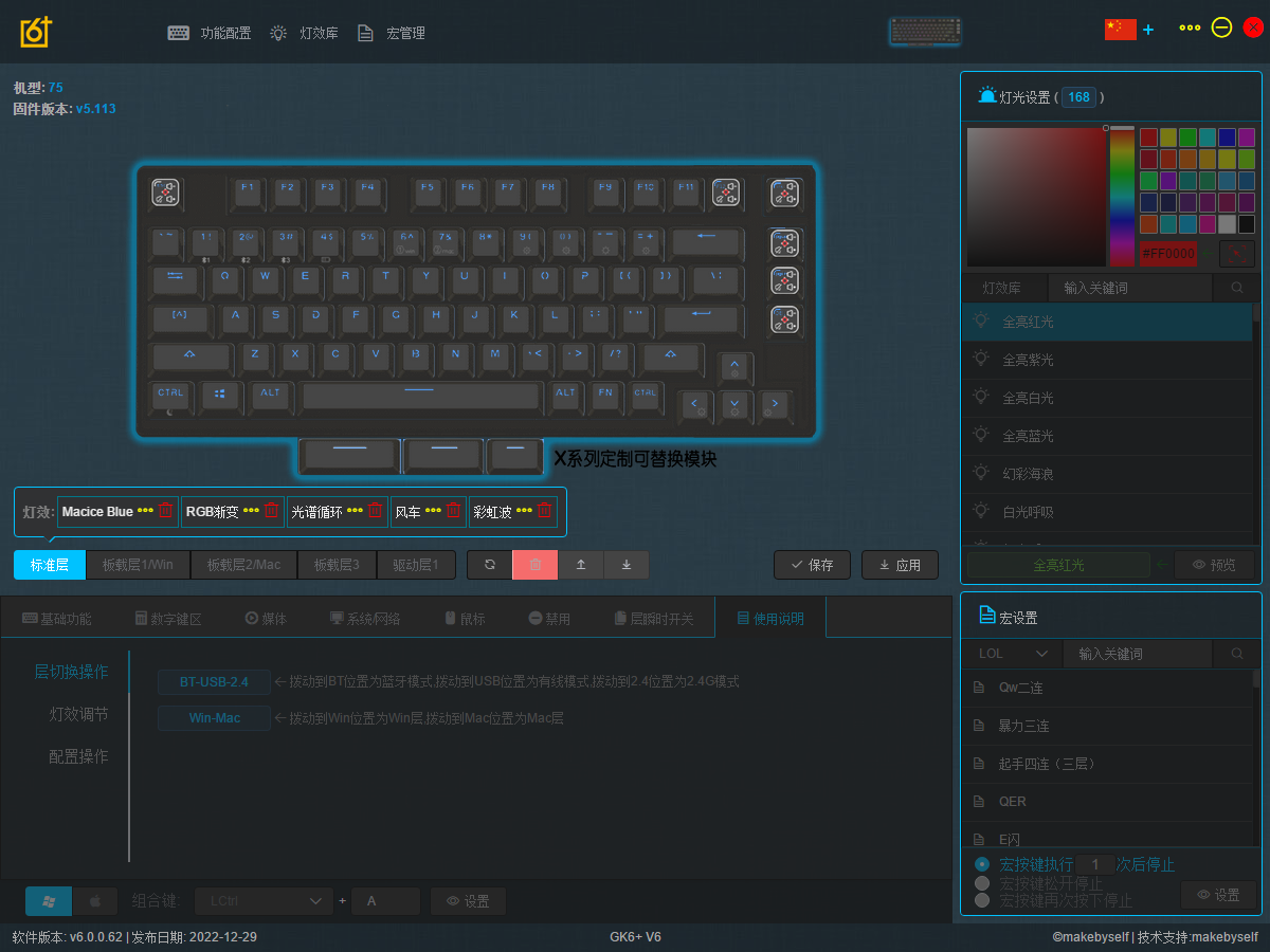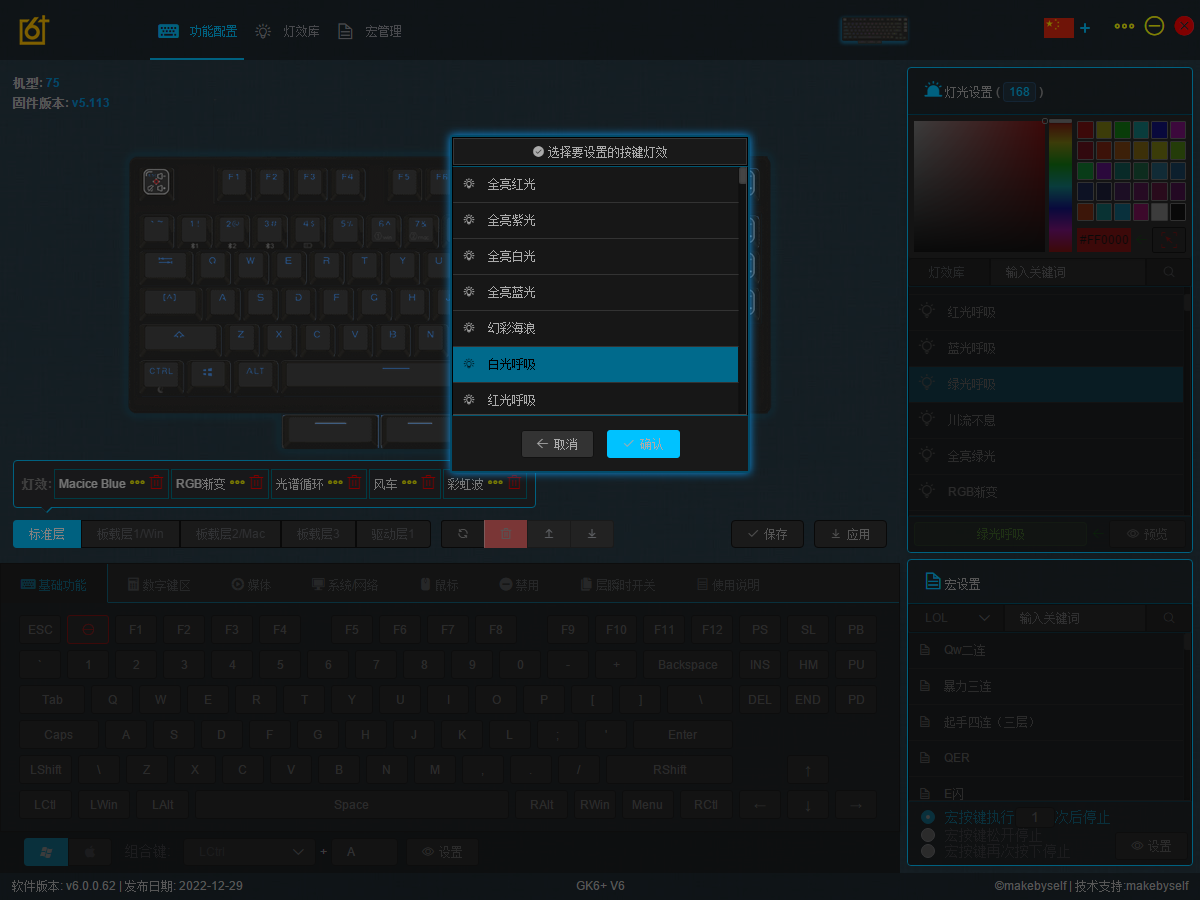 在驱动中可以看到默认的5种灯效,有Macice Blue、RGB渐变、光谱循环、风车、彩虹波,都是比较常见的,当然也可以修改,点击旁边的三个点就能改变,非常方便。