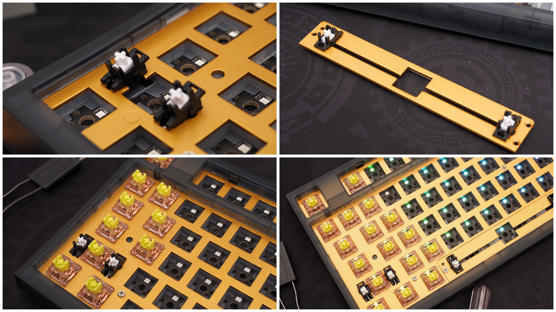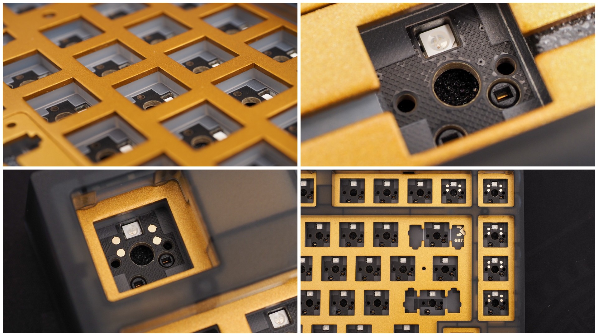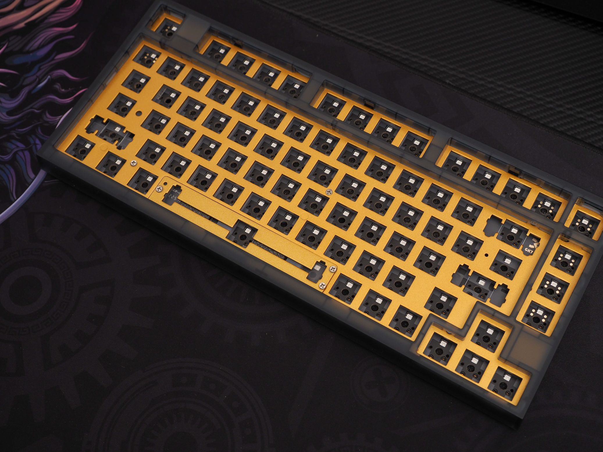 套件的外壳是黑色半透明的硬壳,棱角分明,隐隐约约可看到内部的加强结构。更醒目的其实是亮闪闪的金色定位板,可以看到的是在空格部位有三颗螺丝,这个结构是可以更换的,传统的空格键基本上就是一个轴体加上卫星轴形成一个平衡,但是GK75套件不太一样。还有左Shift、Enter、Backspace按键在轴座两侧还有孔位,这是预留的卫星轴轴座。