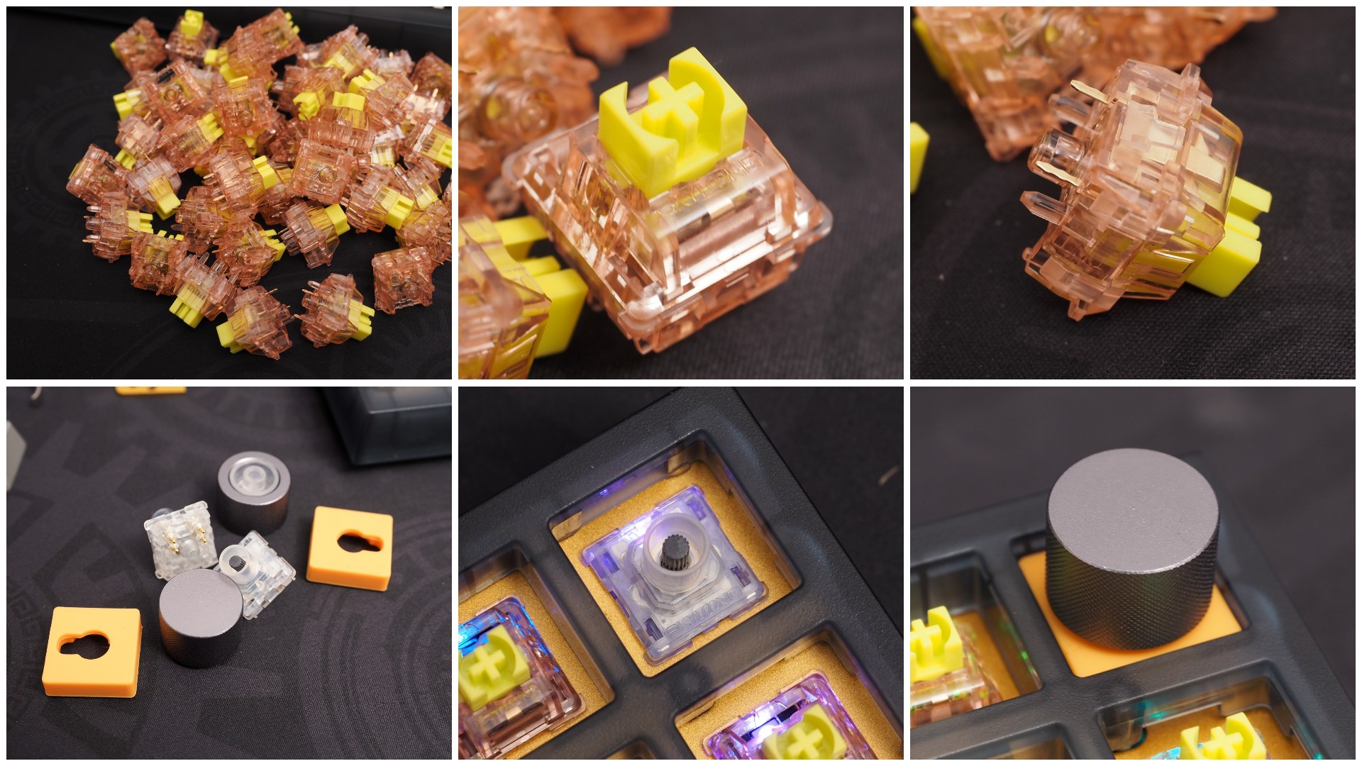 轴体是巧克力V2柠檬轴,壳体是橙粉色,透明的感觉还是很好看的,轴是柠檬色,两者搭配是比较和谐的。而旋钮按键比较特别,轴体是白色透明的,底部有一个金属触脚,轴是一根柱子,轴体和旋钮之间还有一块橙色的硅胶垫,有一定的隔音减震作用。