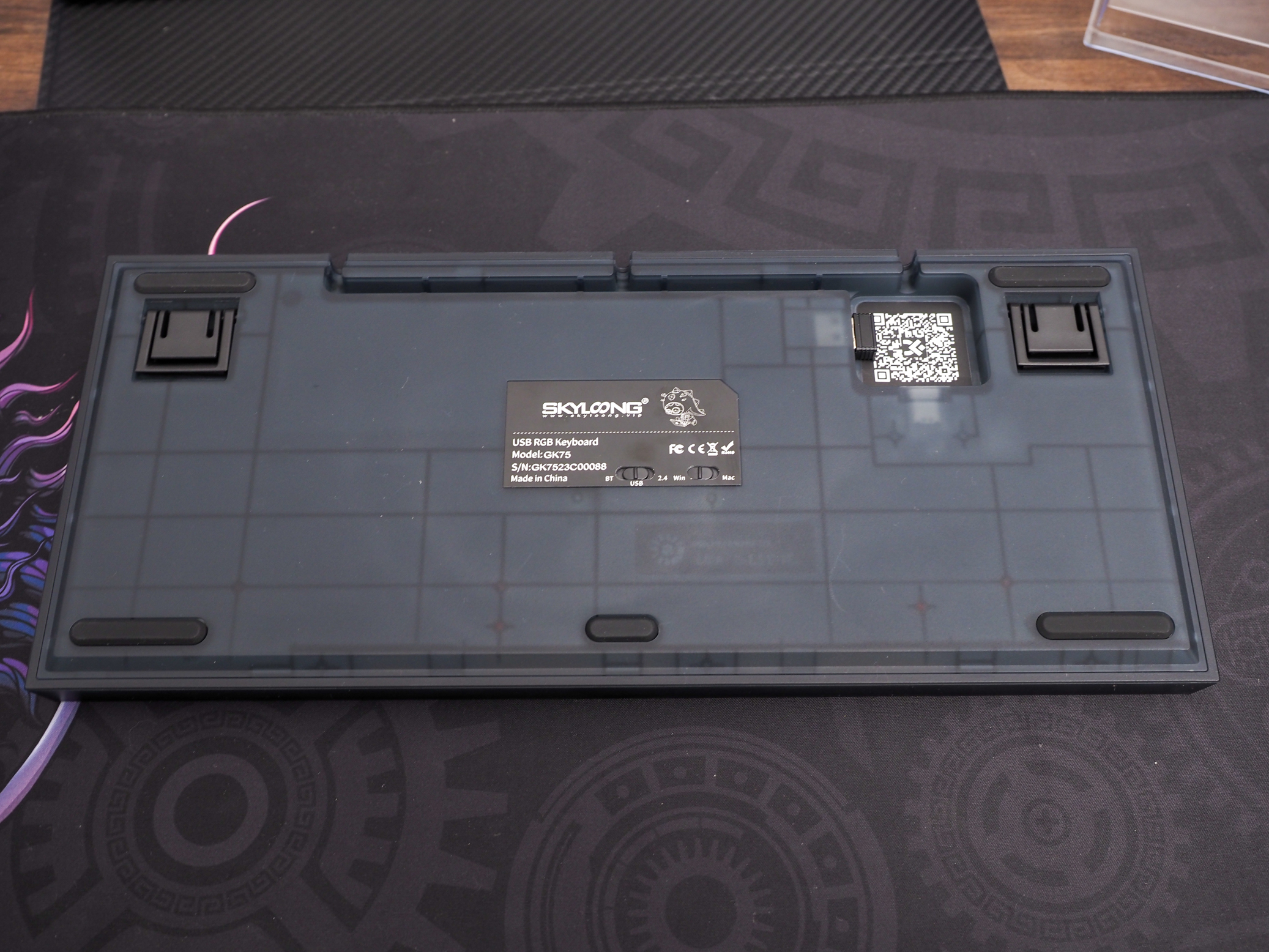 键盘背面的功能设计也是很多的,5个防滑脚垫,2段式的脚撑,USB Type-C线三个方向走线,2.4G无线接收器收纳仓,中间铭牌处还有两个拨档开关,可以切换蓝牙、USB、2.4G,还可以切换Windows和Mac的键位布局,基本上能给的都给了。