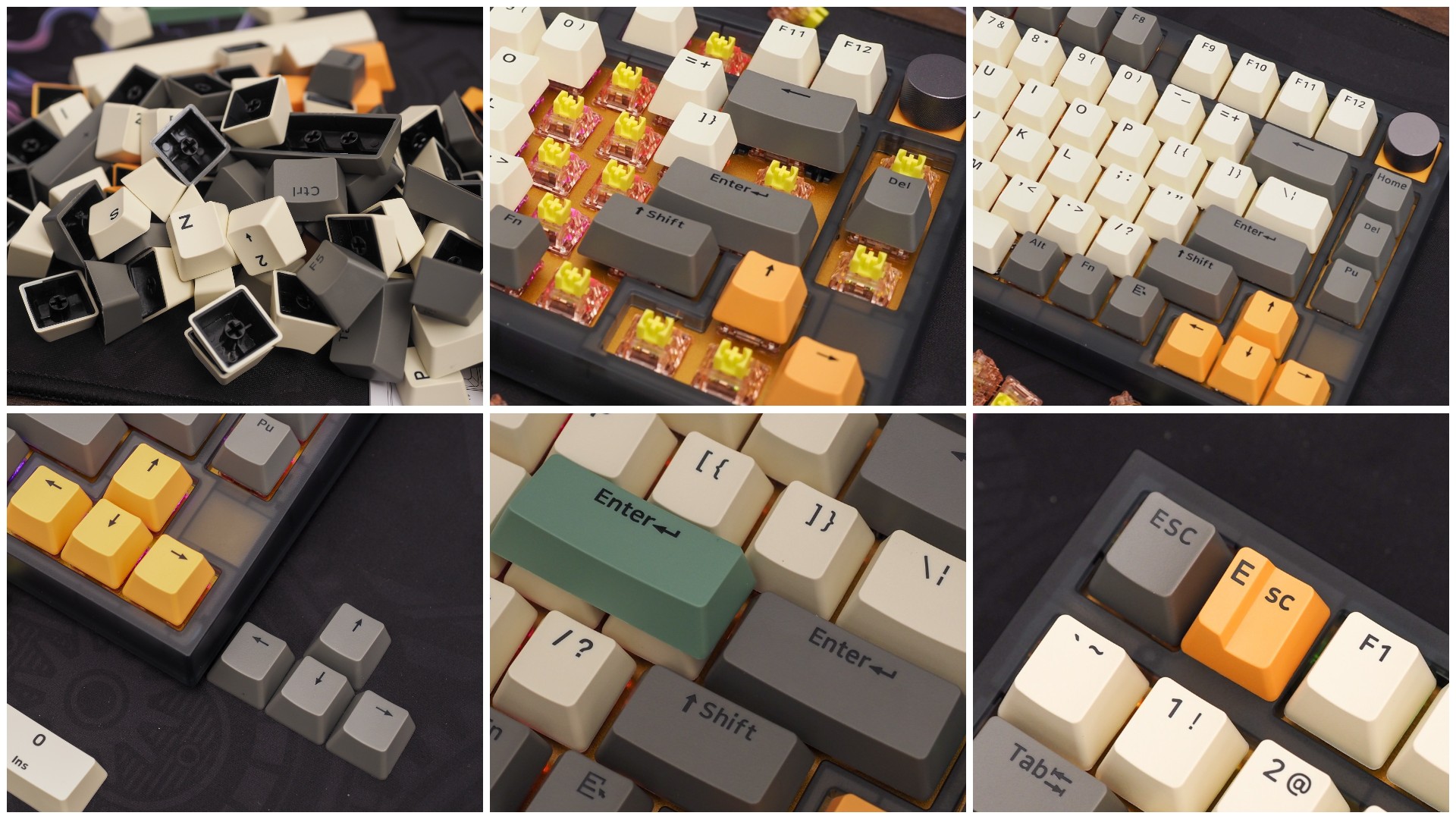 键帽是工业钛灰配色,输入区以米白色为主,功能区是灰色,而方向键是橙色,增添了一丝趣味,当然也有灰色的替换键,像Enter也有一个绿色替换,ESC有个异形键帽替换,还挺有意思的。