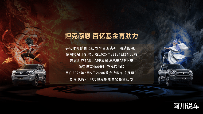 坦克品牌执行副总经理谷玉坤表示:“坦克400柴油版就像《哪吒2》中的魔丸,性能强大、天生神力,适合喜欢户外穿越、拖挂出行的硬核玩家。坦克400汽油版就像灵珠一样,可靠稳重、锐不可当,无惧全场景的挑战,让更多用户在各自的使用工况下得到更极致的体验。”