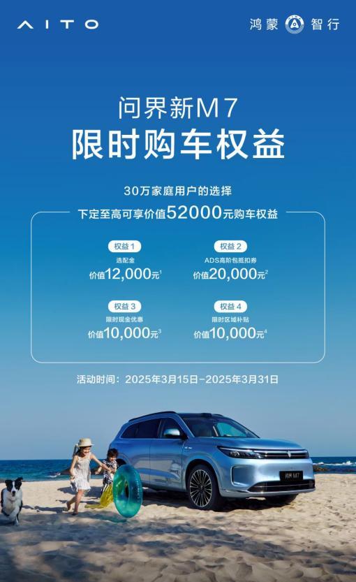 再来看问界新M7的市场策略,针对家庭用户的特殊需求,问界实施了灵活的金融策略。例如,3月期间推出的限时权益升级,各种吸引人的购车政策如三年零息、超低首付等,显著降低了用户的购车门槛。这种策略显然是想让更多消费者感受到智慧出行的轻松与便利。当更多家庭能够以更合理的价格享受到高质量的汽车服务时,问界新M7的销量自然水涨船高。