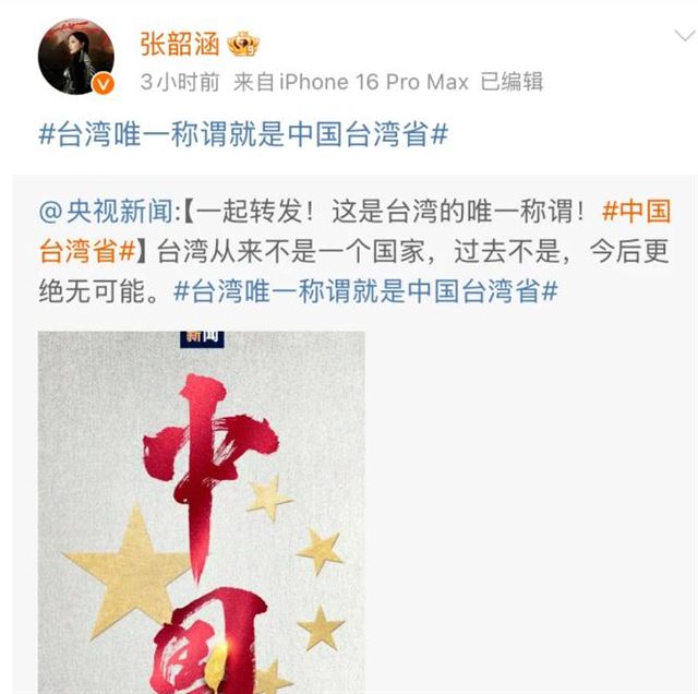这两天的“台湾唯一称谓就是中国台湾省”关键词,被艺人纷纷转发,赵丽颖、刘诗诗、肖战、王一博、张碧晨、易烊千玺等等,纷纷进行了转发。