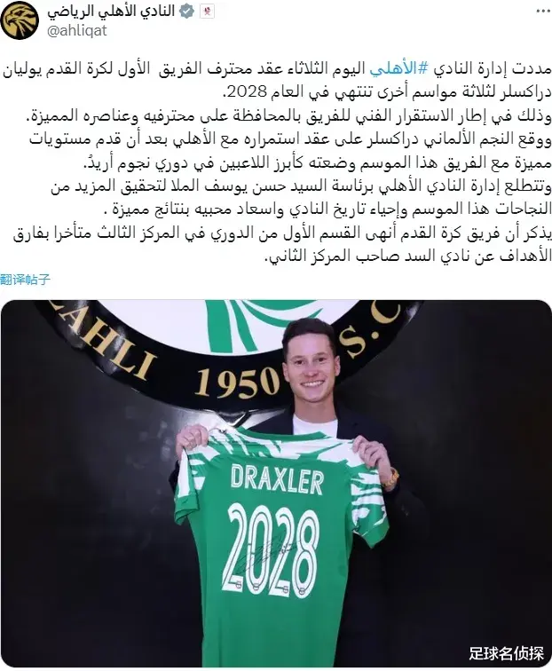 官方:多哈国民俱乐部宣布和德拉克斯勒续约到了2028年。