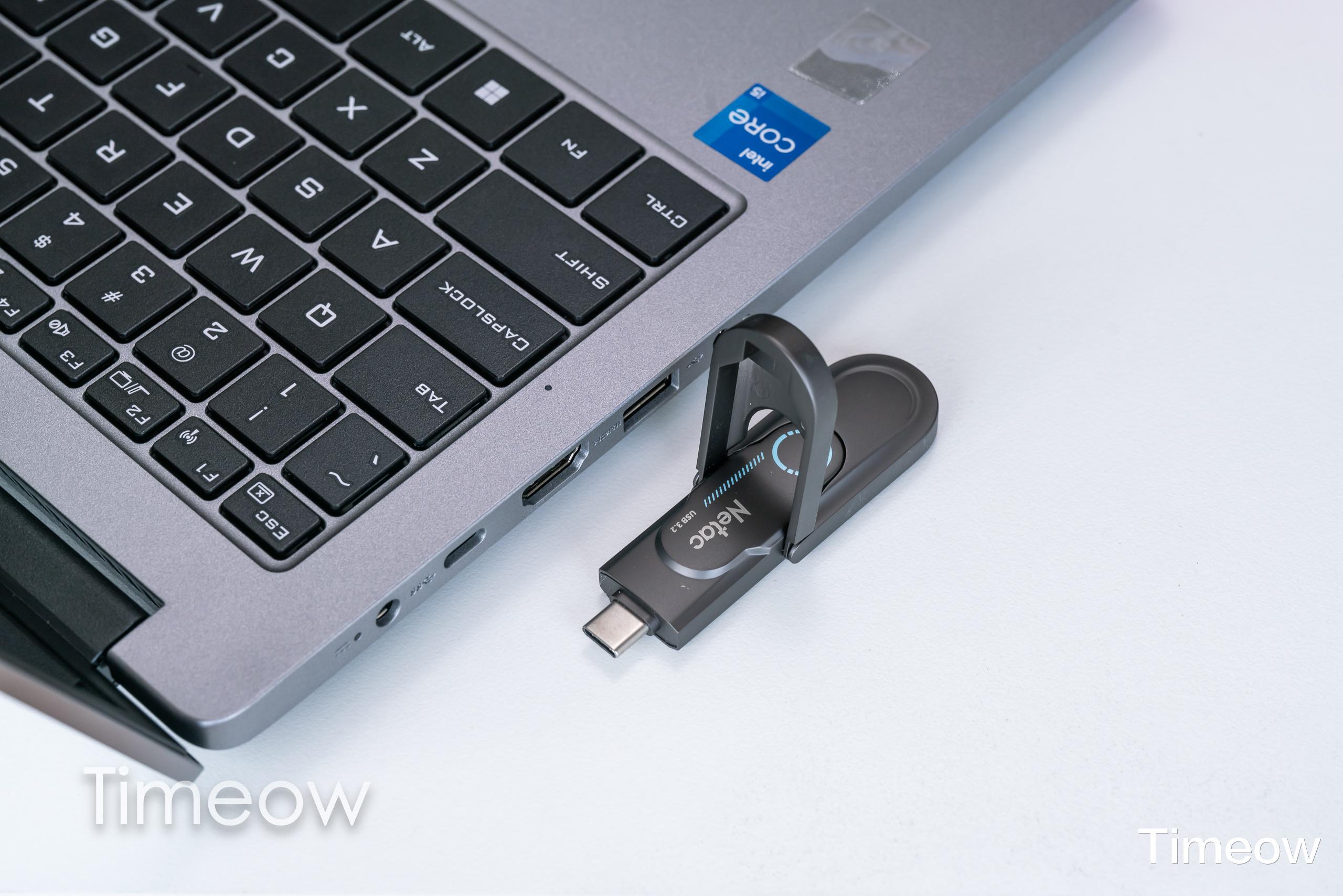 作为一个使用了固态硬盘方案的小U盘,它使用了非常方便的双接口设计,一个USB-A和一个USB-C,不仅可以兼容新老设备,而且还可以直接在手机上插: