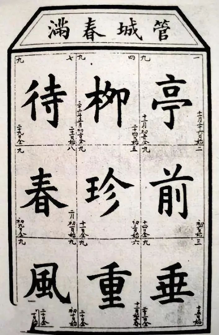 历史学家许倬云先生说过,他小时候刚刚能握笔的时候——其时尚未解放——每个识字的儿童在冬至那天,都会收到一张九九消寒帖。就是给他分一张字帖,这个字帖上写了这么几个字,叫作「庭、前、垂、柳、珍、重、待、春、風」。随后,每日早起头件事,小孩拿着毛笔在那个描红的字印上写一个笔画。并非写一个完整的字,而是按顺序,写一笔。待到把这九个字写完的时候,正好八十一画。