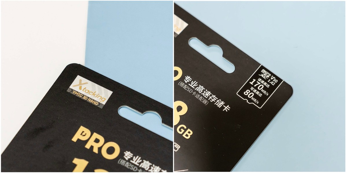 外包装左侧标注了存储卡采用晶栈®Xtacking®架构的存储颗粒,右侧标注了存储卡最高读取速度:170MB/s,最高写入速度:80MB/s。