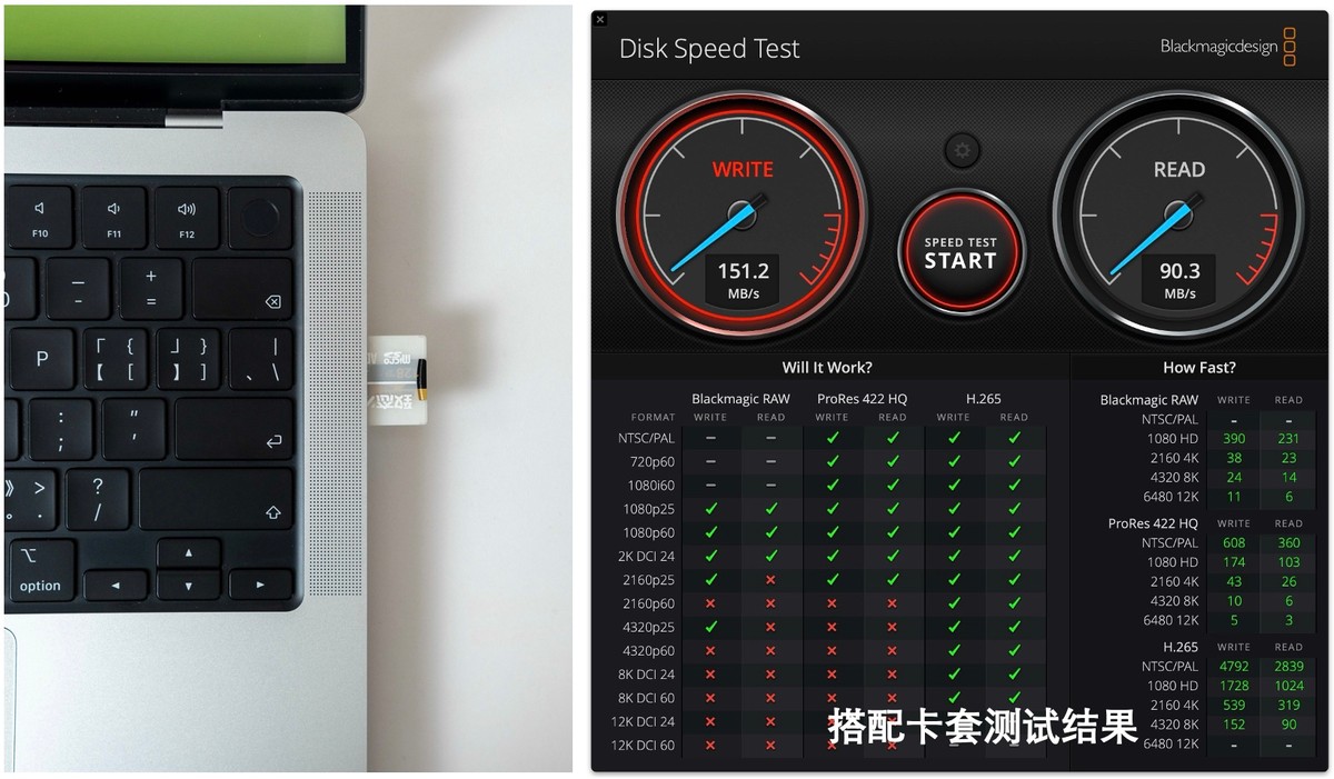 再来看看在 MacOS 平台下,使用「Blackmagic Disk Speed Test」测试,读取速度为151.2MB/s,写入速度为90.3MB/s(搭配卡套测试速度如下)。