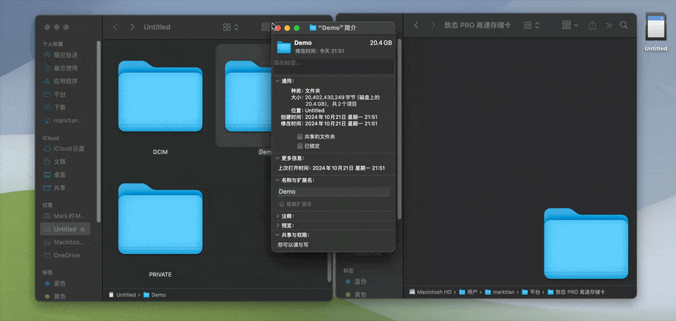 实测 6GB+的 RAW 格式照片从存储卡传输到 MacBook Pro 上用时在 1 分钟多。再来看看传输视频所需要的时间,20.4GB容量的视频拷贝到电脑上实测差需要 4 分钟多。