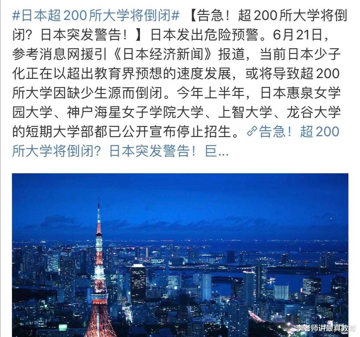 看新闻,日本有超过200所的大学倒闭,原因就是少子化导致的缺少生源,我国未来会不会也是如此呢?很有可能。