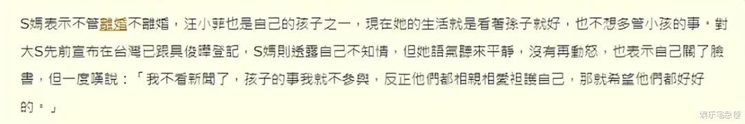 当离婚之后,大S妈妈也没有说汪小菲的不好,甚至对大S离婚表示不满;