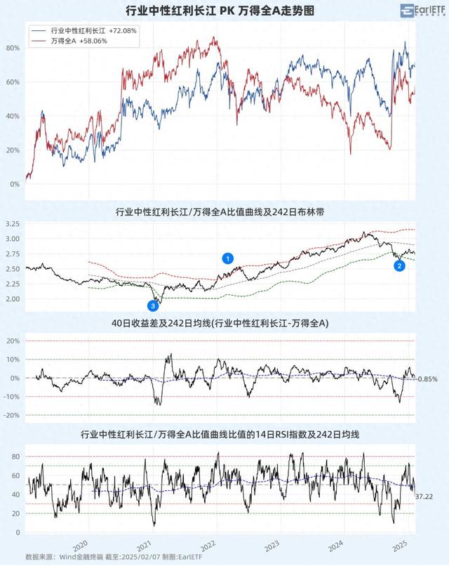 那么,红利的强势终结了么?如果单看去年 10 月比值向下穿破年线布林线下轨(❶)来看,似乎是初步出现了迹象。但值得注意的是,去年那次的向下突破,浅尝即止,很快出现反弹,不似 2022 年初的上穿布林线上轨(❷),是持续数月之久——这种短期下穿,反而有点像 2021 年初下穿的那波(❸)。
