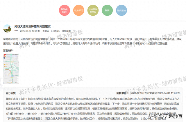 网友反馈 早高峰光谷南三环由西往东方向经常堵车,其中一个原因是三环到光谷大道的右转道红绿灯位置,行人和电动车比较多,通行时间长,造成车流无法快速疏通。建议拓宽这个位置人行道路,马路牙子做成斜坡,电动车方便通过,缩短行人电动车通行时间,有利于快速释放三环车流量,减缓堵车。